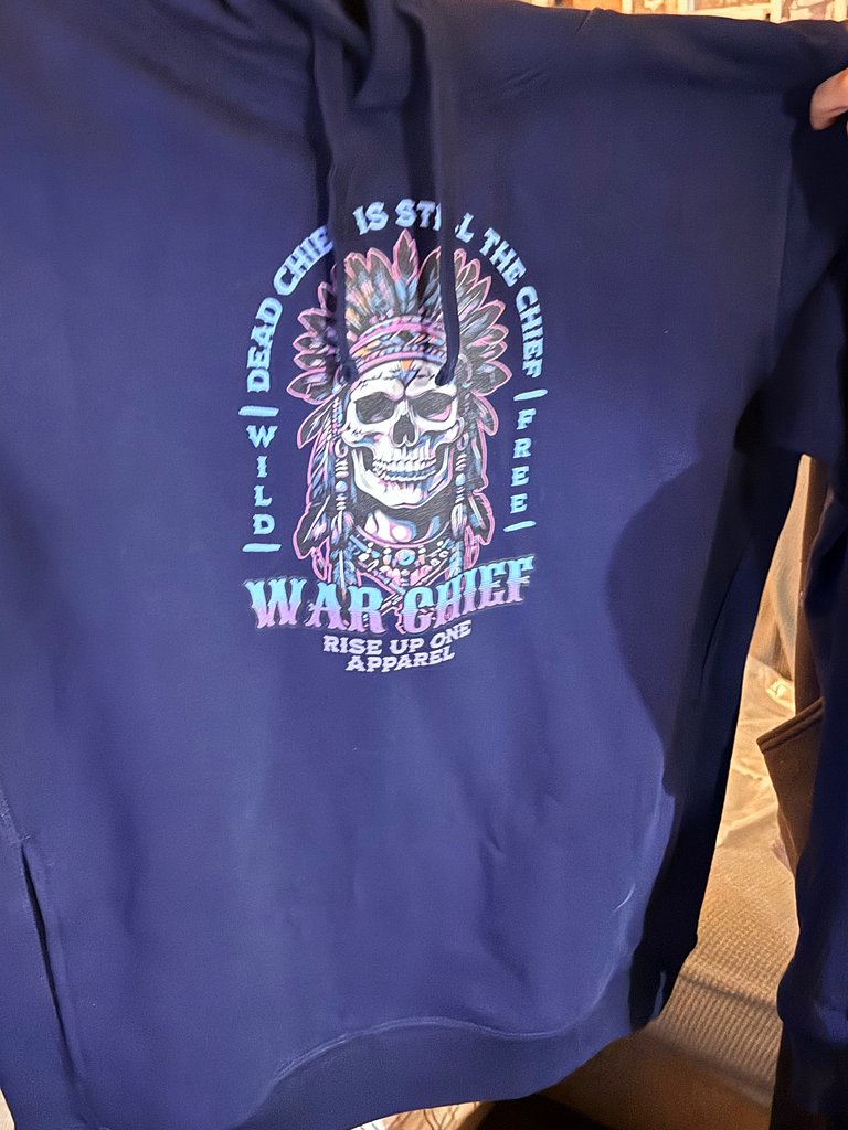 The design of the war chief is very very small. It’s not full center as I thought it was gonna be. And I don’t know if it’s like that on just the medium hoodie because it turned out really well on another one in an XL
