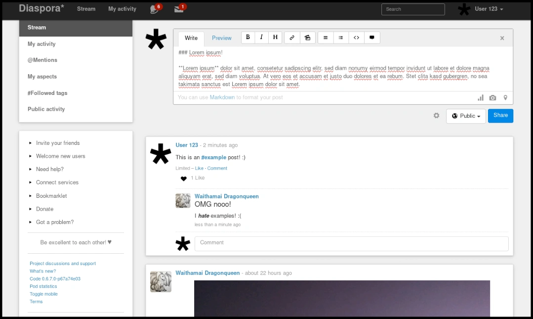 Diaspora also supports hashtags for content discovery, polls, and markdown formatting for enhanced post customization.