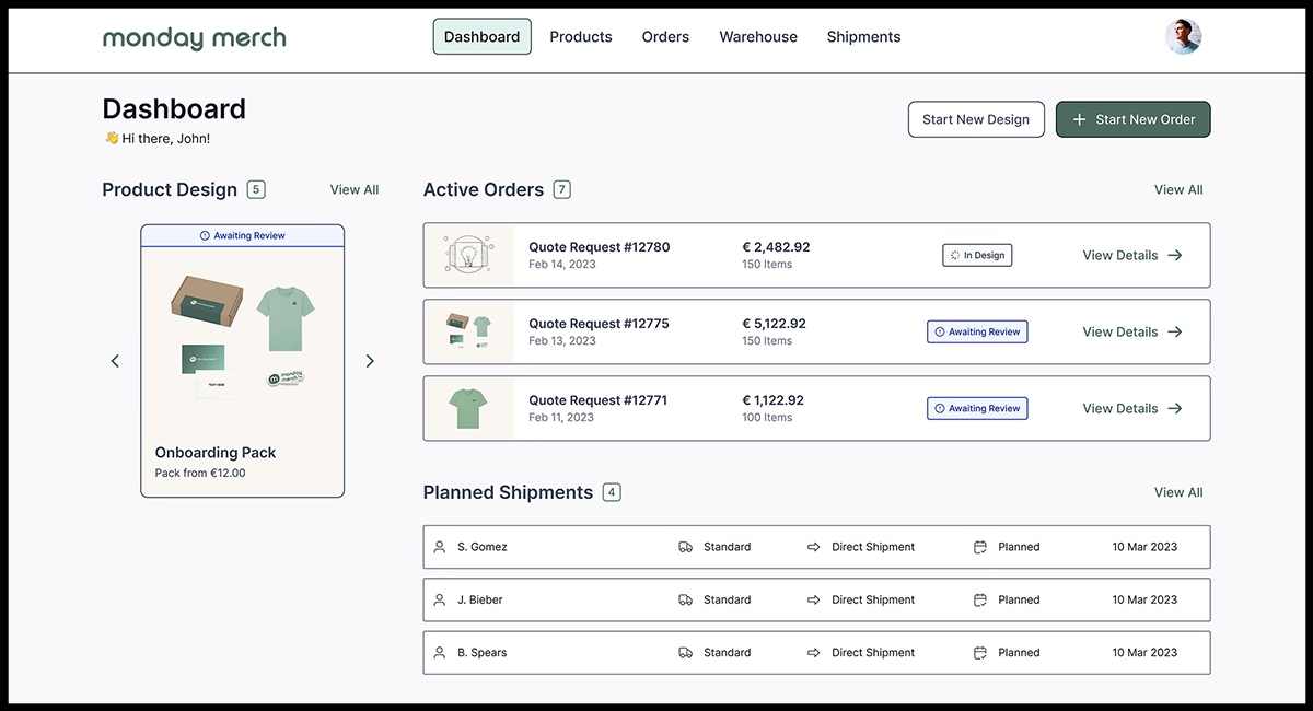 Monday Merch's proprietary platform allows teams to manage every aspect of their swag—from viewing product designs and warehouse inventory to placing orders and organizing shipments.