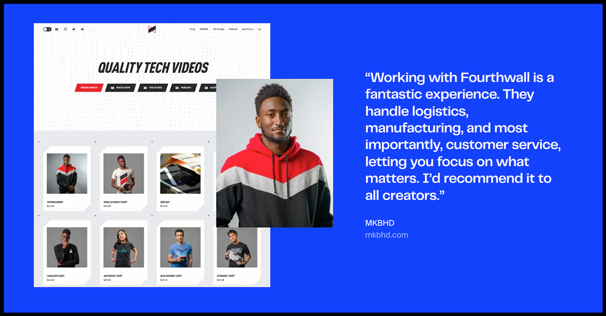 Fourthwall is the top choice for creators who want to design, sell, and fulfill merchandise directly to their audience.
