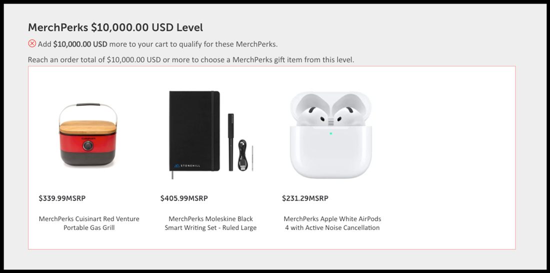 For every qualifying order over $1,000, customers receive a premium gift from a curated rewards catalog. From Zusa jackets to Apple iPads and TUMI luggage, MerchPerks helps turn large orders into high-value incentives.