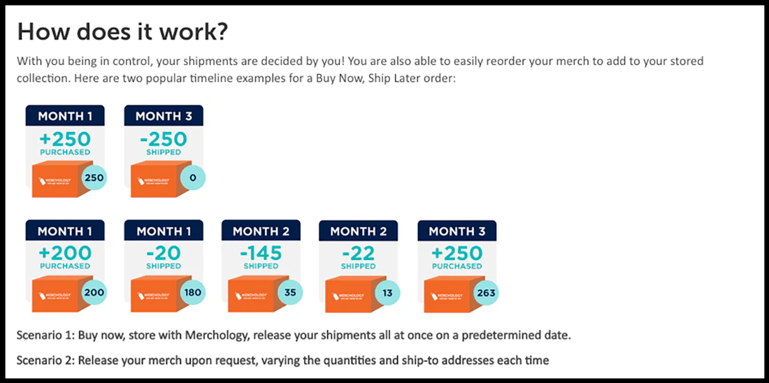 This feature lets businesses purchase merchandise in bulk, store it at Merchology’s facilities, and release it for shipping when ready. It’s ideal for spreading out gifting throughout the year while avoiding storage headaches or shipping delays.