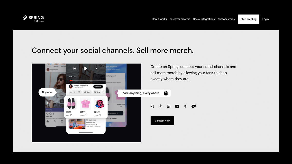 However, where Spring really wins is in distribution. It natively integrates with YouTube Merch Shelf, TikTok Shop, Instagram, Twitch, and Linktree, letting creators sell merch directly where their audience already spends time.