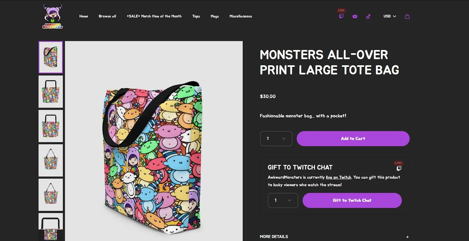 Twitch streamer and Stream Raiders partner AwkwardMonsters designed her own on-brand tote bag with her “AwkwardMonsters” characters as part of her custom merch line on Fourthwall. These totes would make perfect company gift bags!