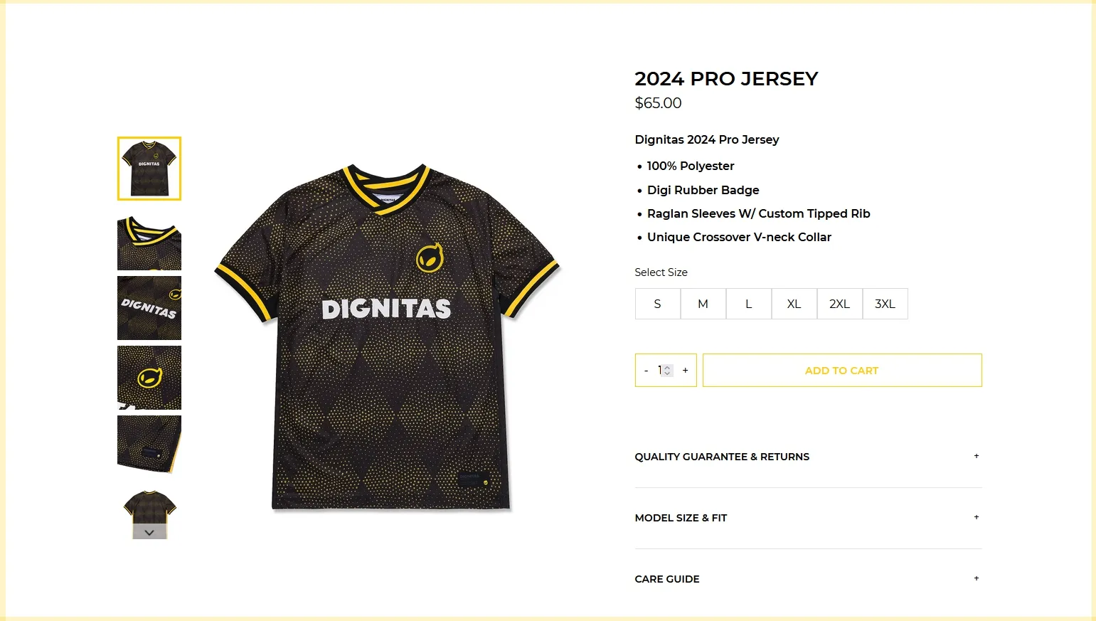 International esports organization Dignitas’ 2024 pro company jersey, as seen on their Fourthwall merch store.