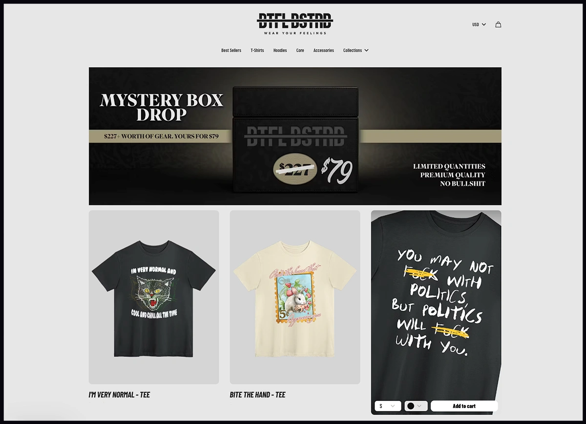 And thanks to Fourthwall’s fulfillment and storefront tools, Beautiful Bastard is able to keep their merch drops smooth and the checkout friction-free, so the brand can focus on fresh designs and hype-worthy launches.