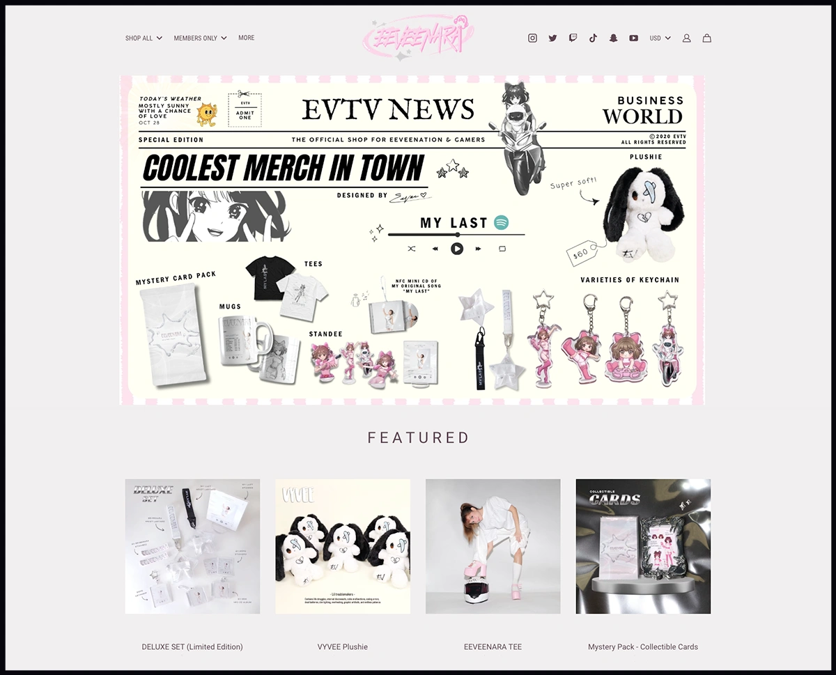 However, what sets Eevee’s store apart is how it doubles as both a merch hub and a fan hub. Her robust shop is packed with themed apparel, including oversized hoodies, cute crop tops, mugs, and stickers — all designed with adorable chibi art and anime references that her audience instantly recognizes.