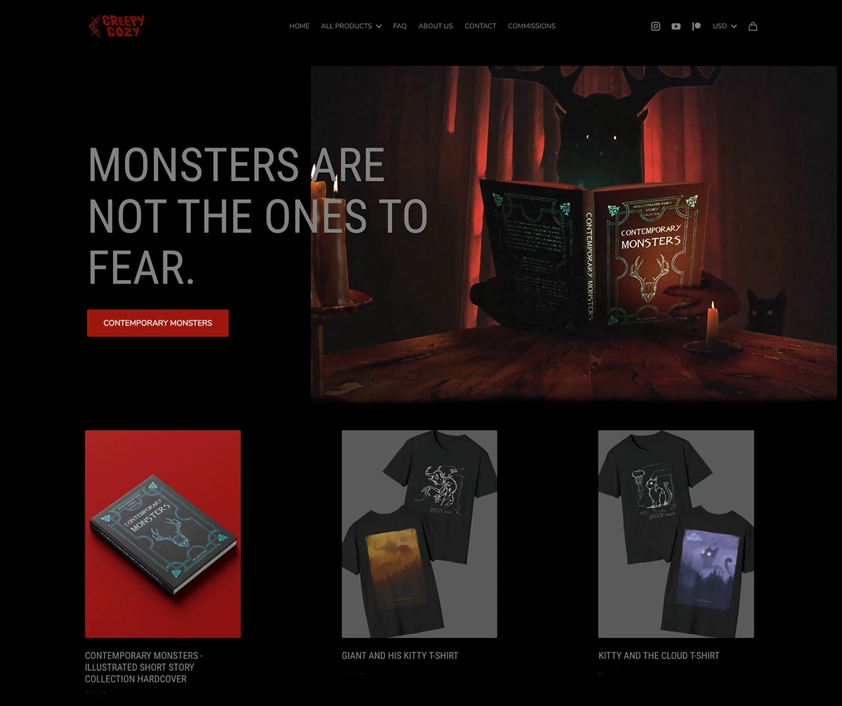 Although their merchandise collection is limited to a few custom-designed shirts and a hardcover book of illustrated short stories, their commissions page is an excellent example of how creators can utilize Fourthwall to transform their site into a personal portfolio for potential customers.