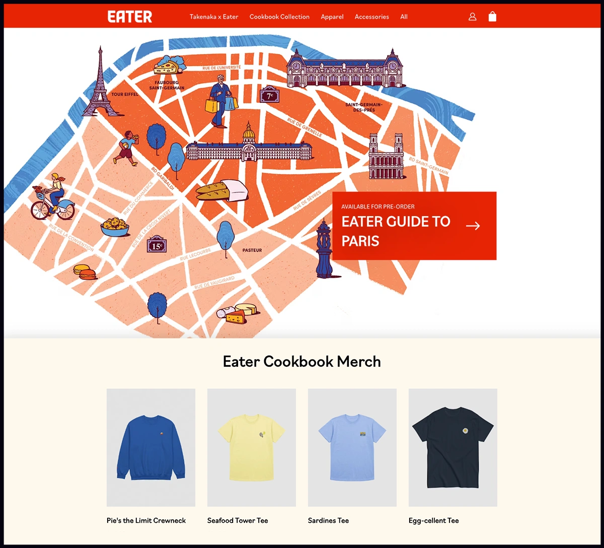 The homepage prioritizes top sellers while also directing fans to other content-rich Eater verticals, including its newsletters, YouTube channel, and the Eater: 100 Essential Restaurant Recipes cookbook.