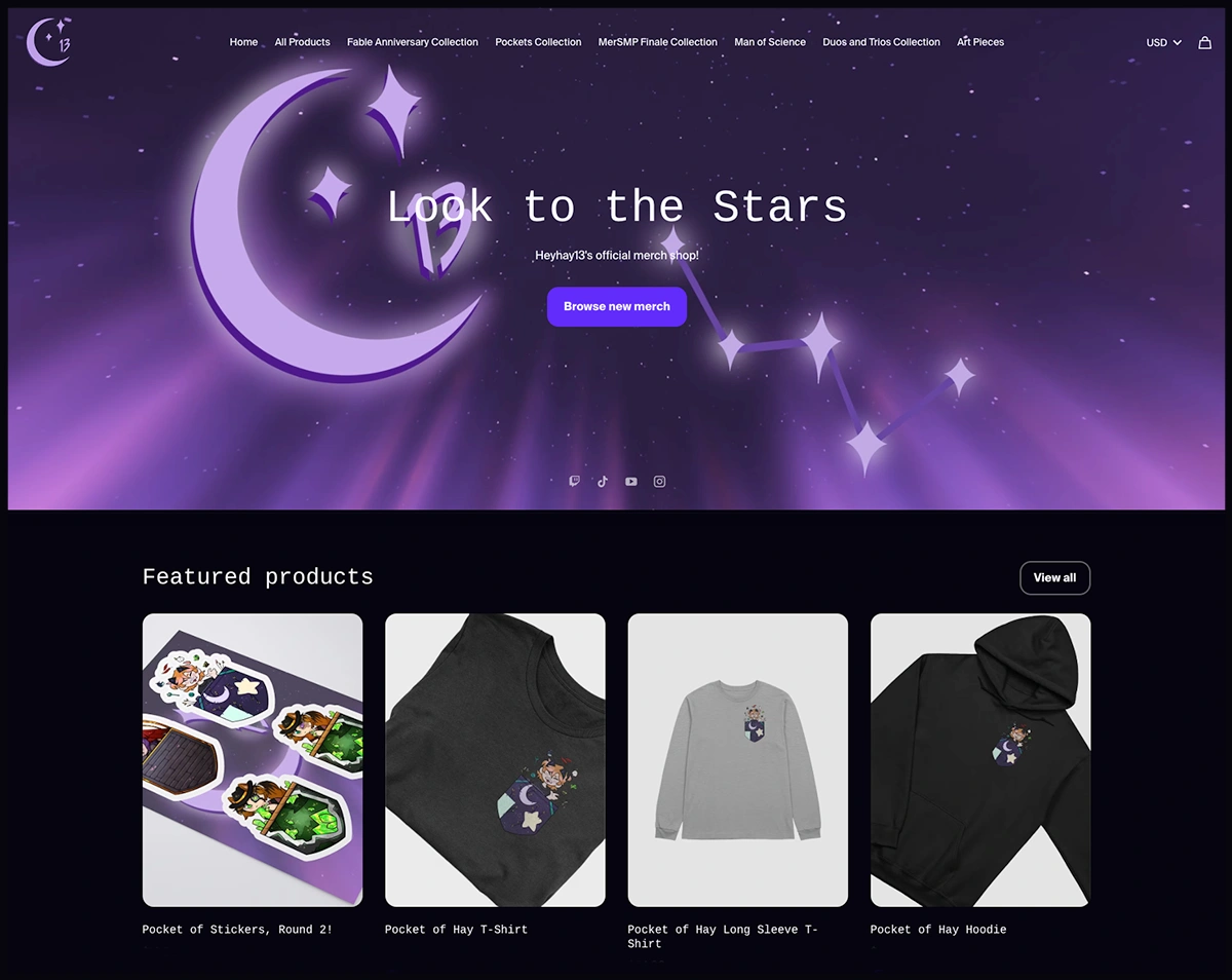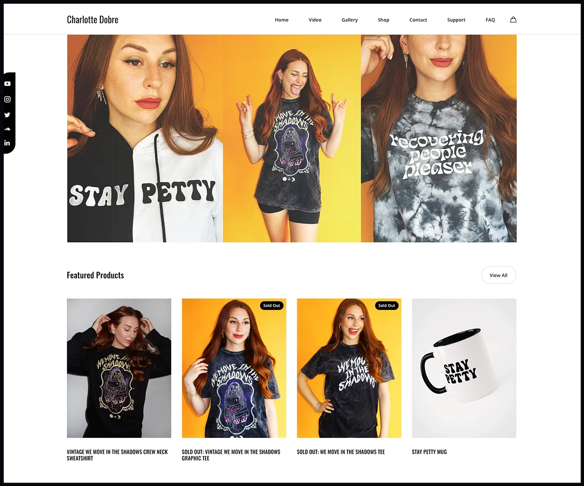 With a slick black social media bar that follows you as you scroll, Dobre’s merch shop proves that a creator’s store can be so much more than a checkout page; it can be an interactive extension of your entire brand.
