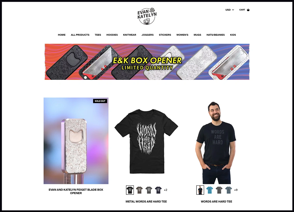 And talk about a collection! The couple offers a variety of one-of-a-kind products, including fidget blade box openers, coffee mugs, stickers, crewneck sweaters, tie-dye tees, and hats.