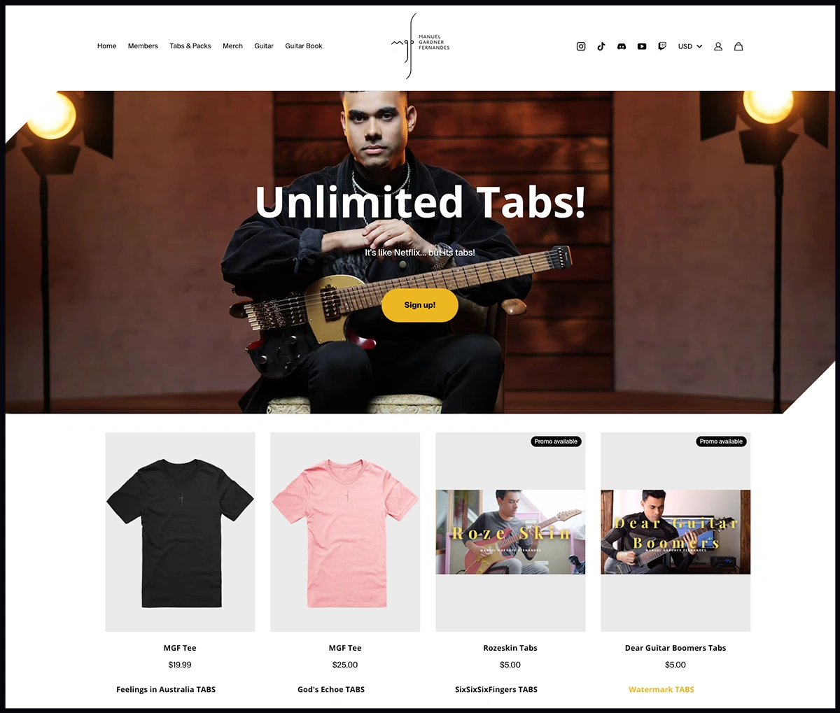 Altogether, it’s an elegant, all-in-one hub that lets this genre-defying guitarist share his music, merchandise, and creative process while maintaining full artistic freedom.