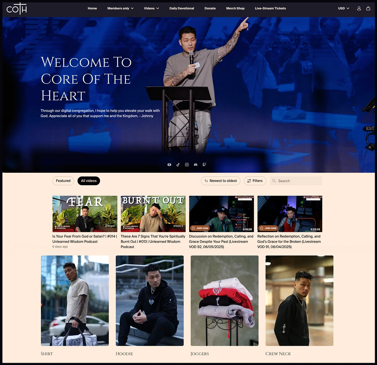 Visitors can instantly explore daily devotionals, binge his candid Unlearned Wisdom Podcast, or watch his self-produced prison documentary and dozens of livestream recordings, which are organized cleanly through Fourthwall’s video hosting and membership tools.