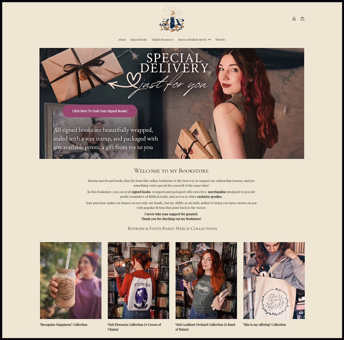 The store layout is clean and welcoming, making it easy for readers to shop by category, snag a signed copy, or download instant digital guides in just a few clicks.