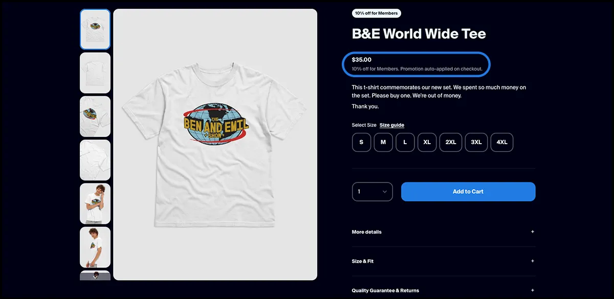 For example, podcasters Ben and Emil price their B.E. World Wide Tee in a way that resonates with their audience and supports strong profit margins.