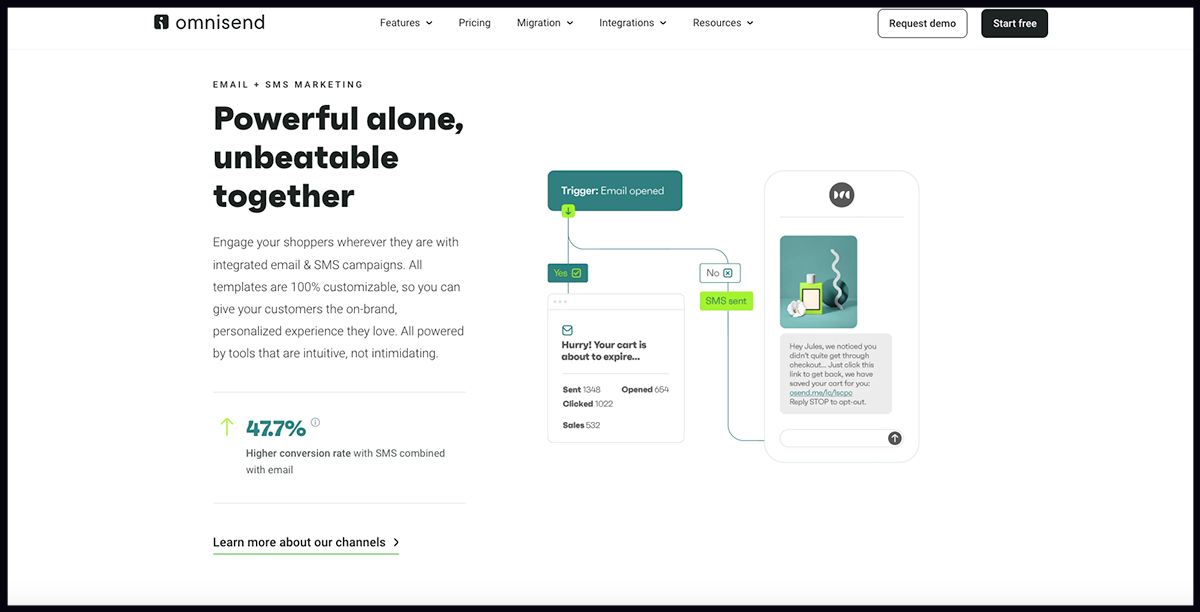 What sets Omnisend apart is its seamless integration of email, SMS, and push notifications, along with engaging tools like gamified pop-ups and sign-up forms that convert casual visitors into loyal subscribers.
