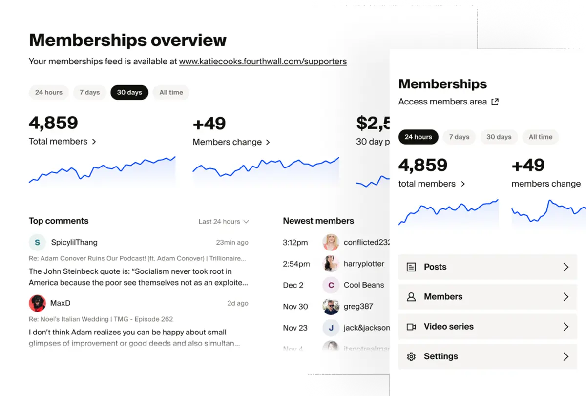 Additionally, Fourthwall offers built-in analytics to track your sales, memberships, customer behaviors, and product performance, providing a comprehensive view of your business's growth and helping you adjust strategies to better serve and connect with your customers.
