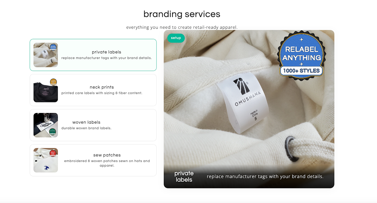 With options such as woven labels, neck tags, embroidery, and custom packaging, it’s a platform for creators who take their branding seriously.