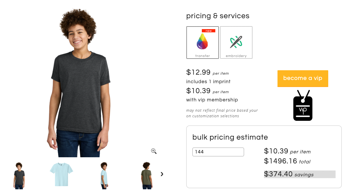 It offers a solid catalog of apparel from well-known and reliable brands, such as Gildan, Bella+Canvas, Stanley/Stella, and more, with digital direct printing, flex, and sublimation options available depending on the product.
