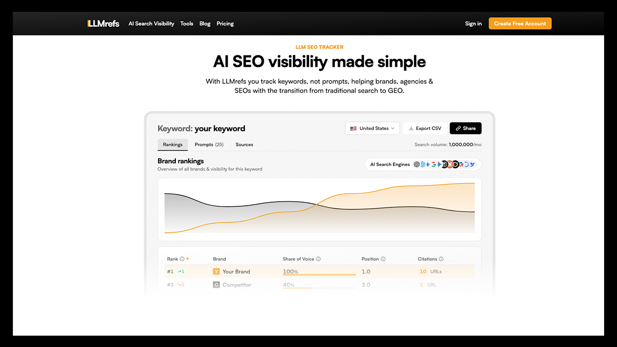 Unlike standard SEO platforms that only track rankings in Google, LLMrefs measures how often your brand, products, and content are cited inside AI-generated answers across platforms like ChatGPT, Gemini, and Google AI Overviews.