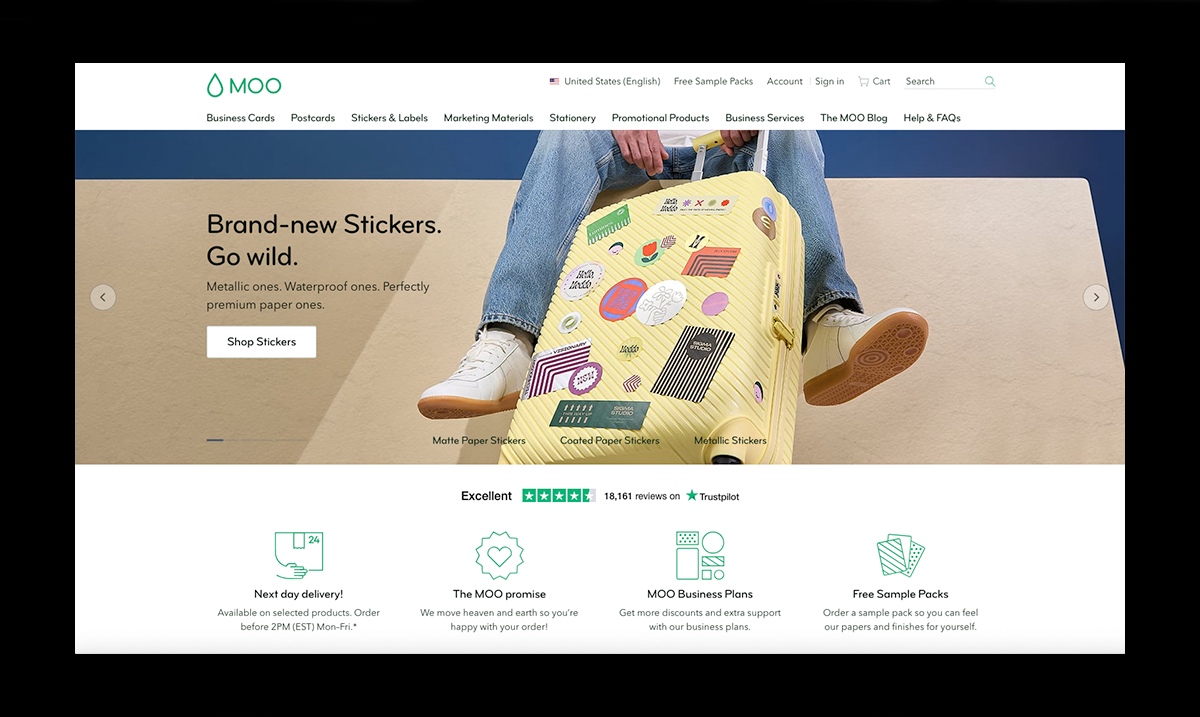 Moo is more than just a printing service; it's a full-featured custom print marketplace offering everything from business cards and postcards to branded stationery, stickers, and promotional items.