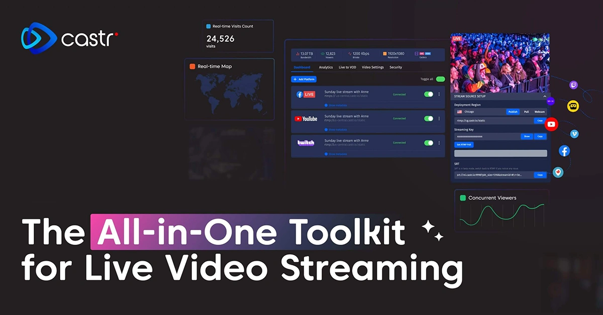 Castr is essentially a Swiss-army knife for video; one platform that enables you to go live, multistream to multiple destinations, host VOD, monetize your content, and keep everything secure without juggling a stack of separate tools.