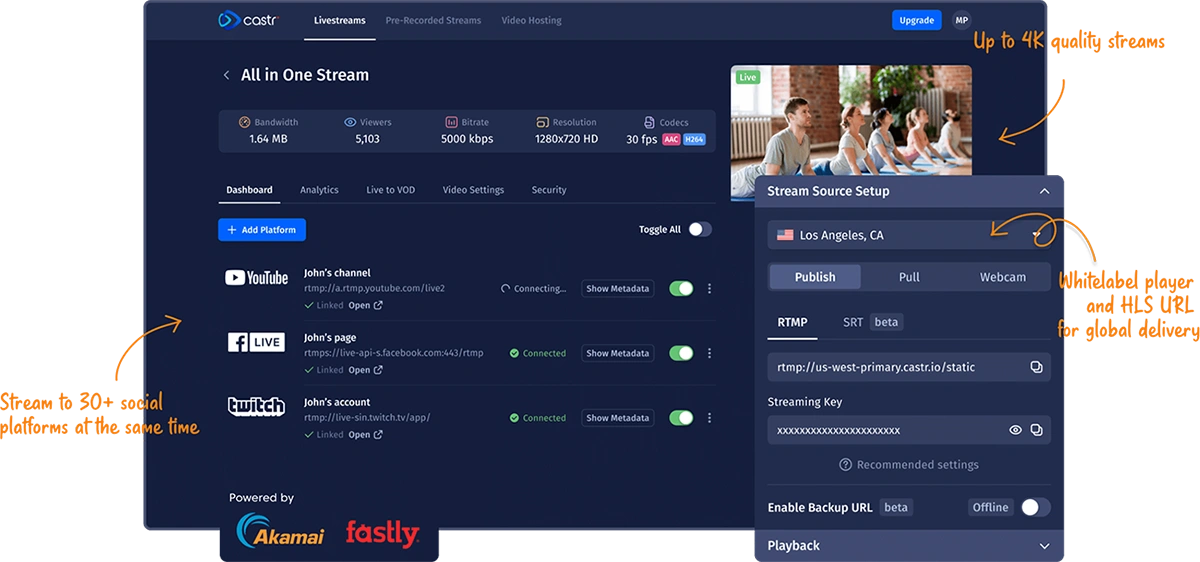 Yes, Castr’s multi-streaming feature lets you simulcast your live events to more than 30 destinations, including YouTube, Twitch, Facebook, and LinkedIn.