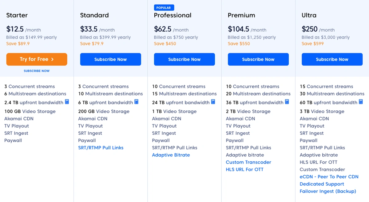 You can start with the affordable Starter plan if you’re just getting started with multistreaming, then upgrade to higher tiers for advanced features such as adaptive bitrate, custom transcoders, OTT-ready HLS URLs, and even peer-to-peer eCDN with dedicated support.