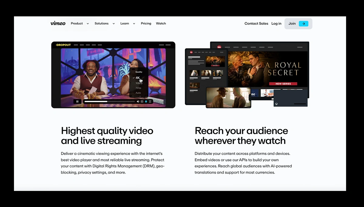 Add live streaming, branded OTT apps across iOS, Android, Roku, Fire TV, and Apple TV, plus robust analytics and built-in marketing tools, and Vimeo becomes an end-to-end solution for creators who want to scale their video business with polish and control.
