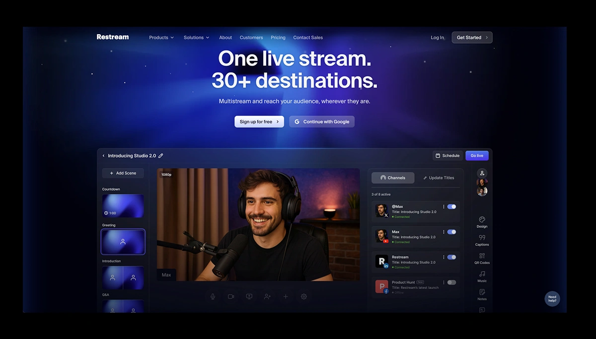 While it isn’t a full OTT/VOD library like Castr, Restream shines for reach-first creators looking to pair live distribution with built-in overlays, QR codes, and a web player (on higher tiers) to funnel viewers to their storefronts, memberships, or monetization tools.