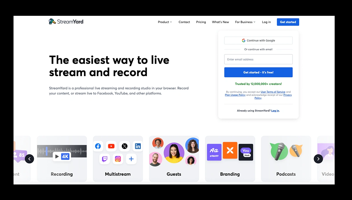 However, unlike most platforms on this list, StreamYard doesn’t offer any built-in monetization features, such as subscriptions or paywalls. Nevertheless, it integrates seamlessly with platforms that do, making it a polished choice for creators and companies focused on audience engagement and reach.