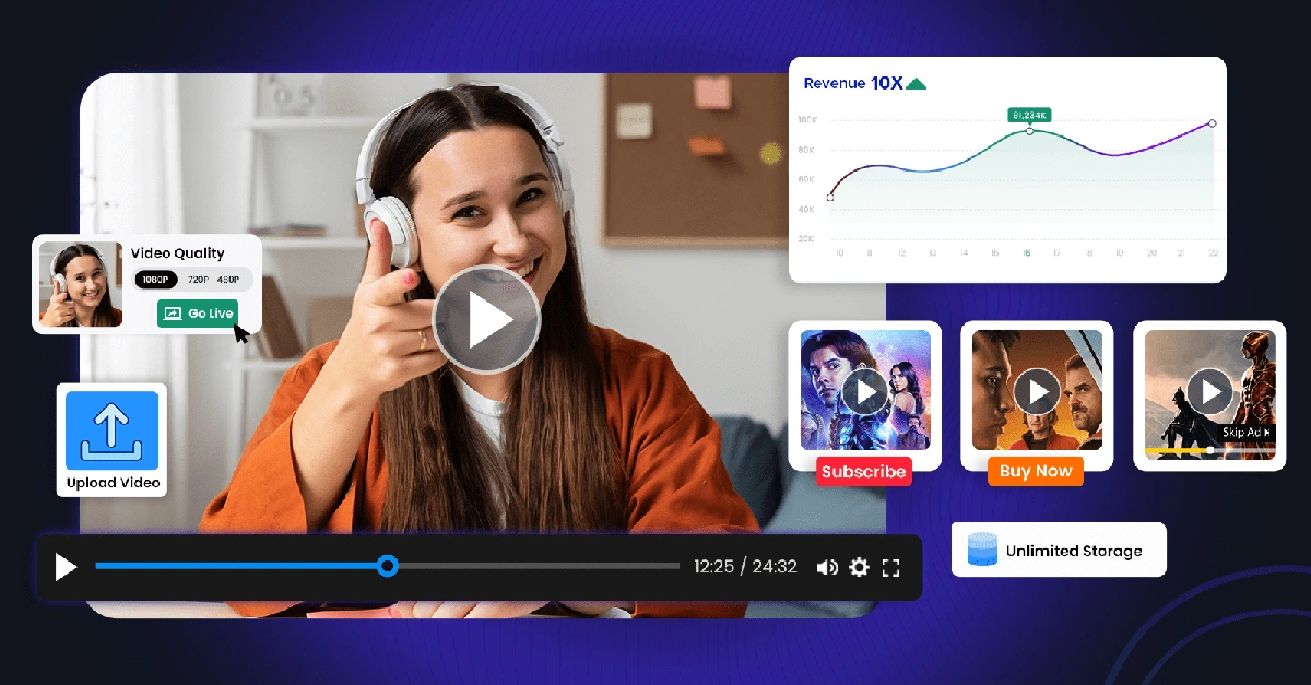 You can upload HD videos, build premium video catalogs, and offer subscriptions, pay-per-view events, or rentals, all wrapped in your own branded website and native mobile/TV apps.