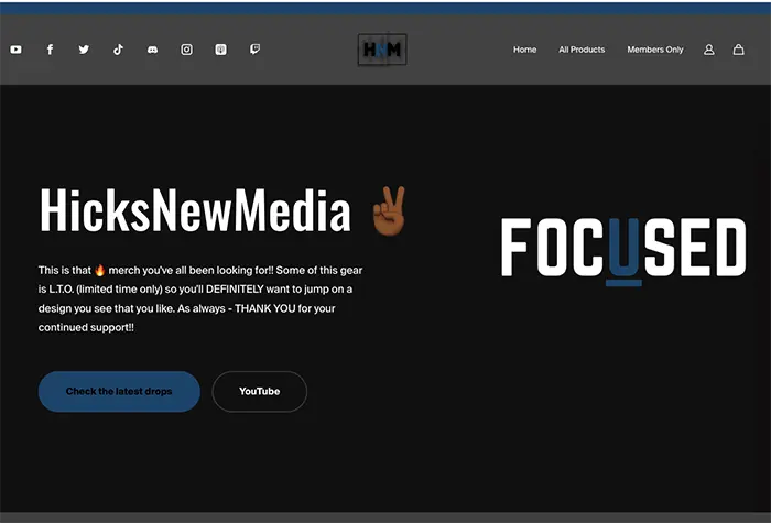 James Hicks's website is a masterclass in structure and hierarchy. Hick's site applies a clean and cohesive design, featuring a predominantly monochromatic color scheme running up and down the page. His layout puts everything out on display, showcasing merchandise, social media content, membership tiers, and a donation box, all of which are systematically layered and visually engaging. His strategic placement of high-quality visuals, including the use of high-res images to showcase his products and content, establishes a professional tone that entices users to interact with his page.