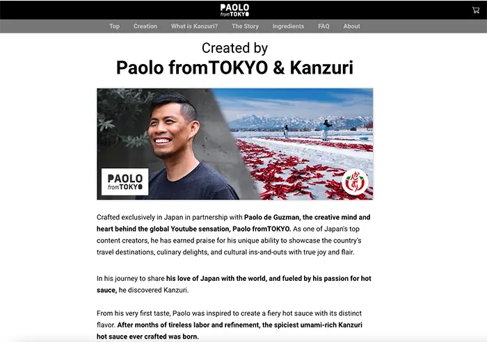 Paolo FromTOKYO's one-page design showcases the power of storytelling. Through images and text, Paolo takes visitors on a journey that reflects his brand and personality. His page is strategically structured to promote and sell his brand of Kanzuri hot sauce, with the product being the first thing you see as soon as you pop on the site. As you scroll down, Paolo's call-to-action is integrated into a captivating story that explores the history and craft of making Kanzuri hot sauce. It's a lively narrative full of vibrant colors and beautiful imagery, illustrating Paolo's dedication to producing the spiciest hot sauce for his consumers.