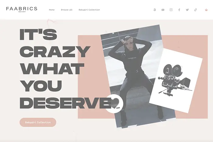 Maria Gloria's website stands out with its engaging visuals, creative color palette, and captivating header that establishes the beauty creator's flair for classic cinema. Gloria's page illustrates a retro-indie film vibe, with motion elements all throughout the site. Her layout is simple but minimal. With limited content on the page, Gloria showcases only her slogan, apparel, and call-to-action, creating a quick and smooth flow that effortlessly blends all elements into one.