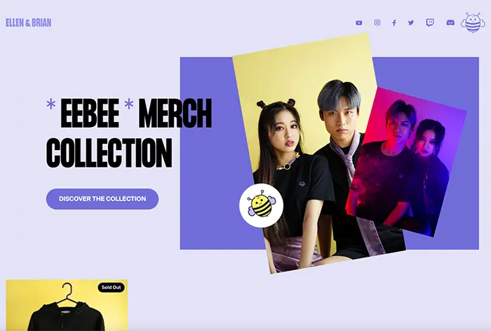Ellen & Brian's page is a testament to how an aesthetically pleasing layout can significantly impact your website. The K-pop duo integrates warm colors throughout their site with a yellow and purple contrast that immediately locks viewers to the screen. The site's use of interactive graphics is simple but appealing, avoiding the need for clutter. Like Maria Gloria's site, Ellen and Brian's one-page promptly displays their merchandise and links to their social media channels, with a call-to-action button directing users to a separate page displaying the couple's merch.