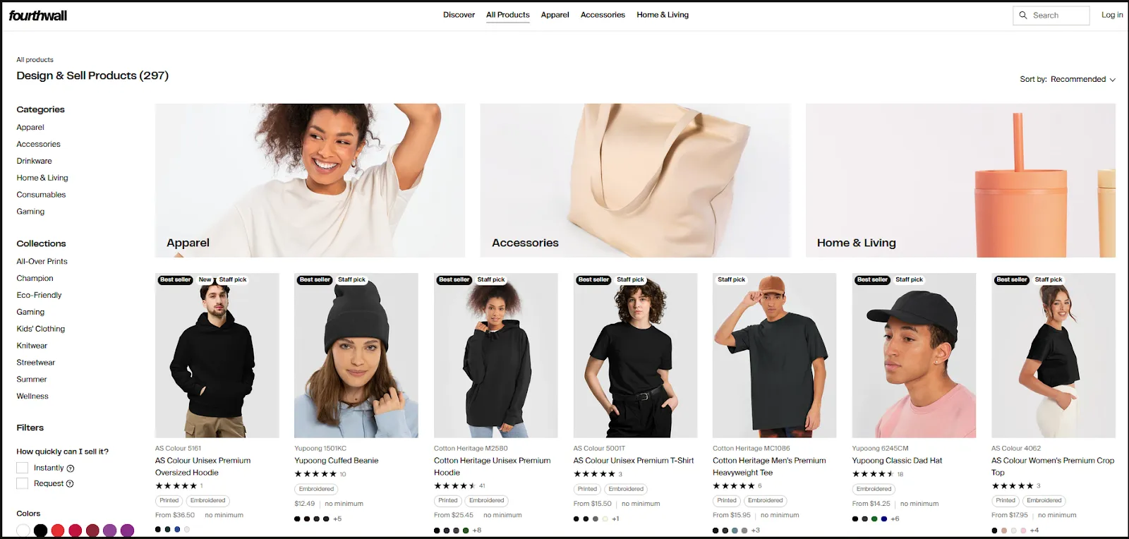 Print on demand (POD) is a business model similar to dropshipping, but with more customization. POD focuses on custom products like T-shirts mugs, and tote bags that you design, and then your ecommerce platform of choice prints the items and ships them directly to your customers. Using platforms like Fourthwall, you can create and sell products without any need to manage inventory. Fourthwall lets you customize your own online store and your product listings, so your store reflects your brand and is a great headquarters for your POD designs.