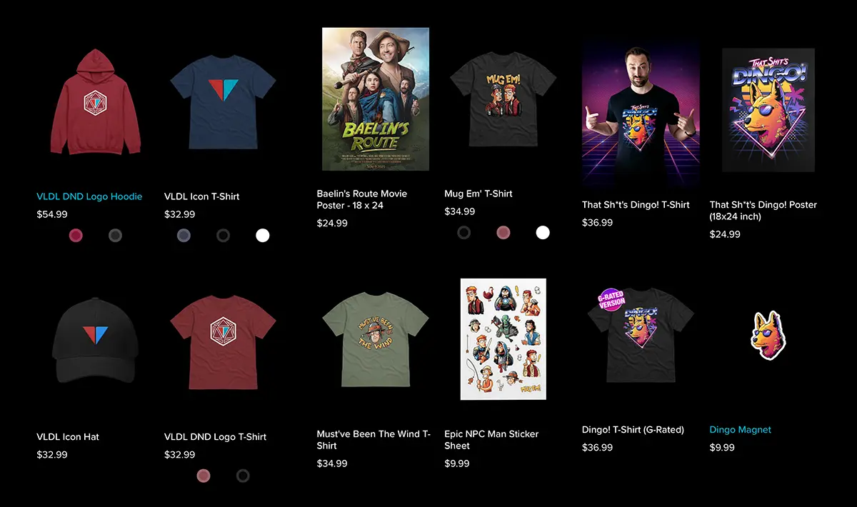 Similarly, Viva La Dirt League, a YouTube comedy group known for their gaming and fantasy comedy skits, taps into their audience's love for immersive storytelling by offering merchandise inspired by their characters and series. This approach not only reinforces VLDL's brand but also gives fans tangible ways to connect with the world they created.