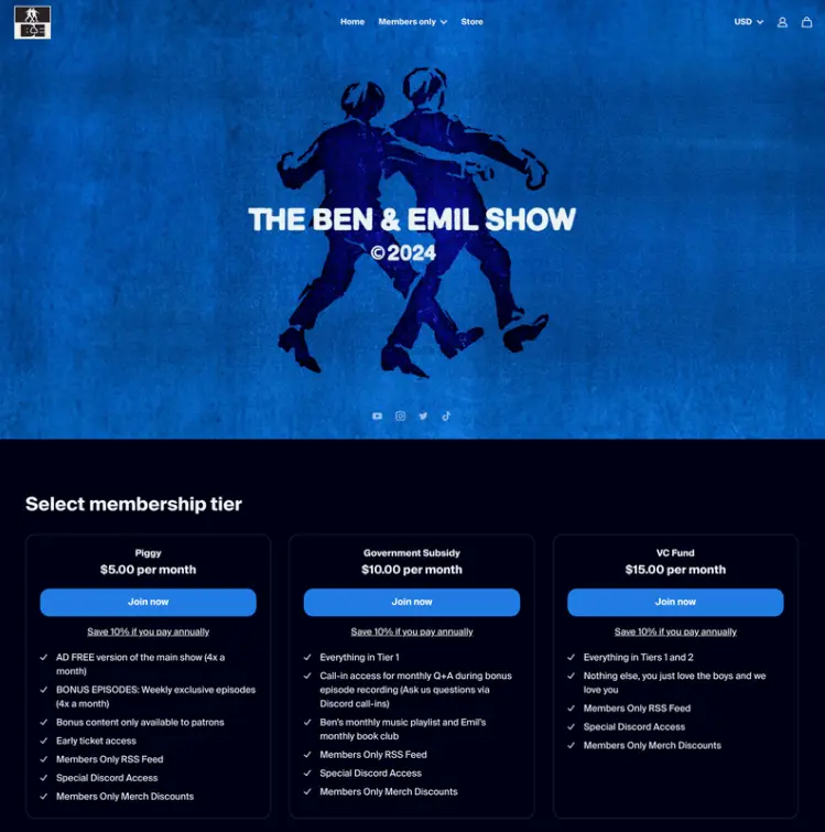 For instance, Ben Cahn and Emil DeRosa, the creators behind the popular podcast The Ben & Emil Show, leverage exclusive memberships on their website to help build their engagement and community. The comedic duo offers perks such as early access to new episodes, behind-the-scenes content, and personalized shoutouts. These exclusive benefits not only incentivize fans to join but also cultivate a tight-knit community of supporters who feel directly connected to the creators.