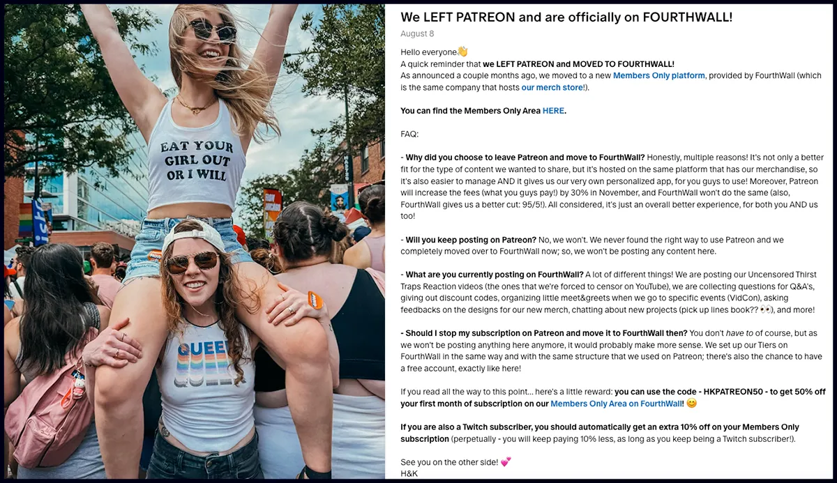 To make the move enticing, the couple offered a 50% discount on the first month for those who joined Fourthwall early. This introductory incentive lowered the barrier to entry, especially for existing members who appreciated the gesture and felt rewarded for their loyalty. By minimizing financial concerns, they helped ease any reluctance among subscribers about switching platforms.