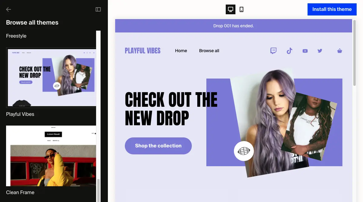 If you're looking for a cost-effective alternative, Fourthwall provides no-code website templates for free when you sign up. The platform offers a range of unique themes that help you get started quickly, and you can easily customize colors, fonts, layouts, and other elements to reflect your brand’s identity.