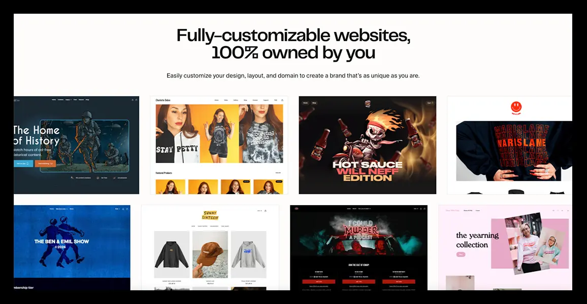 However, platforms like Fourthwall offer an alternative by eliminating upfront costs or monthly fees. Instead, Fourthwall allows creators to build and launch their websites for free, with monetization features such as ecommerce or memberships.