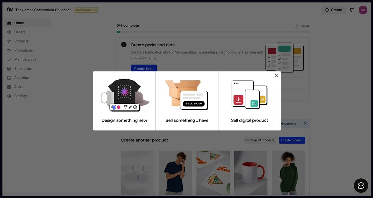 Head to Fourthwall and sign up for your free account. You can use an email or social login, and in minutes, you’ll land in your personal creator dashboard, aka your control center for everything from product creation to orders and site design.