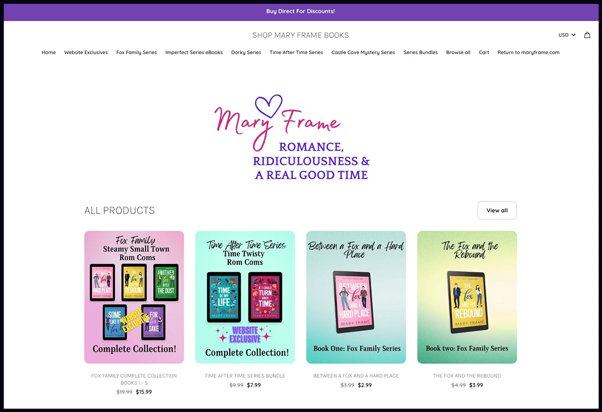 Frame’s store feels like a personalized book boutique, complete with personality, discounts, and direct-from-the-author access that most readers can’t get from places like Amazon or traditional bookstores.