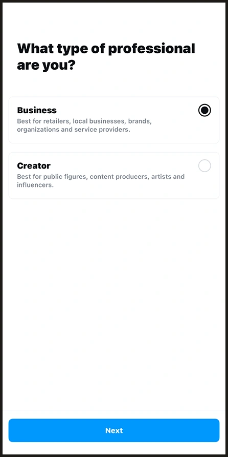 On the next screen, choose “Business” instead of “Creator.” A business account is best suited for brands, companies, or entrepreneurs looking to use Instagram’s advanced marketing tools.