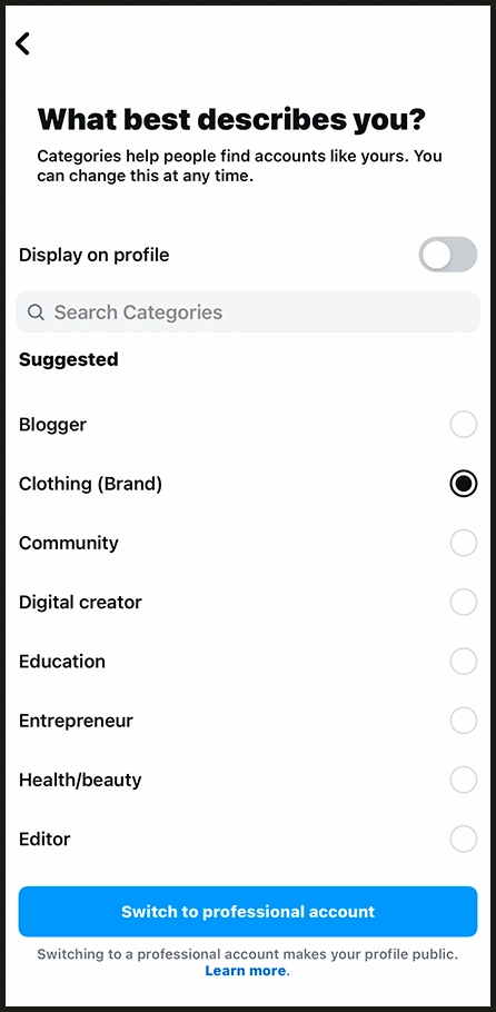 Select a category that best represents your business, such as Retail, Health/Beauty, or Photography. You can also choose whether or not to display this category on your profile for your audience to see. Once selected, click “Switch to Professional Account.”