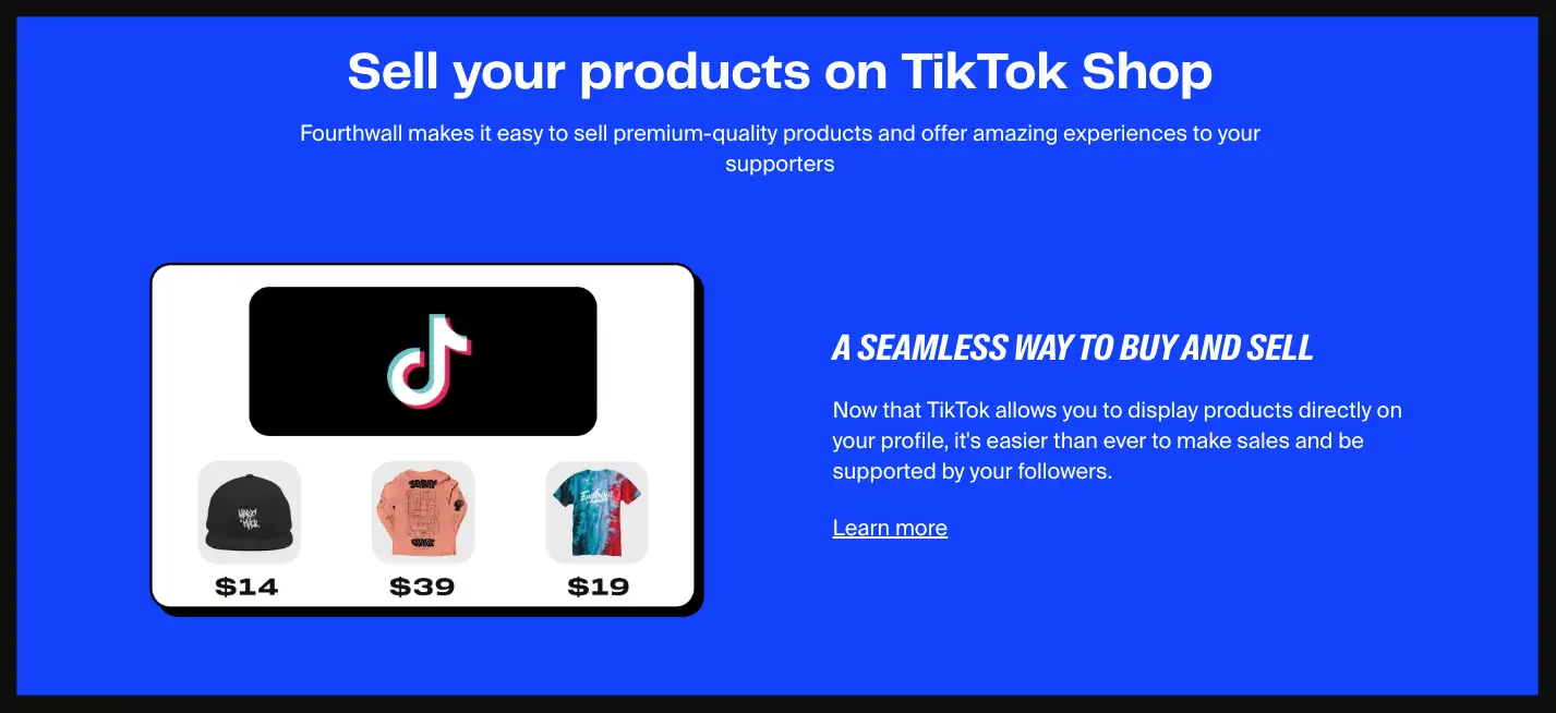 Fourthwall's user-friendly interface allows creators to quickly set up their own storefronts and integrate them with social media platforms like TikTok, making it easy to promote and sell their products directly to their audience.