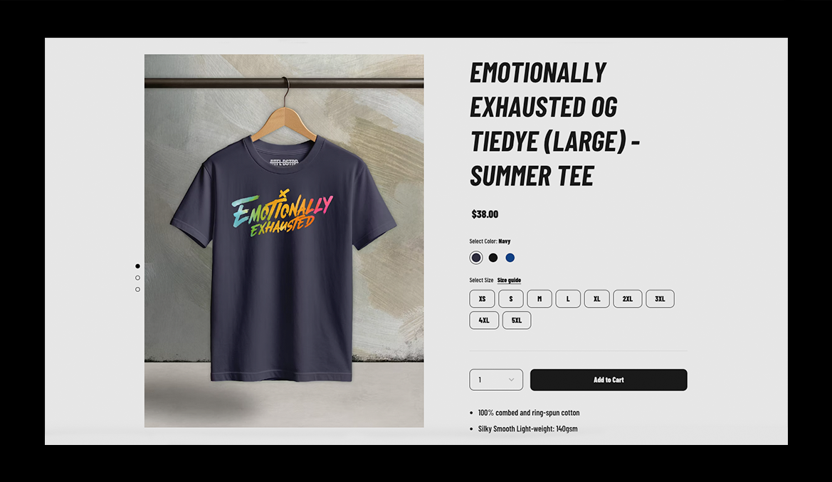 His custom merchandise includes a wide variety of tees, tank tops, hoodies, mugs, and canvas prints, all featuring clever, relatable sayings like "Emotionally Exhausted" and "God is Testing Me."