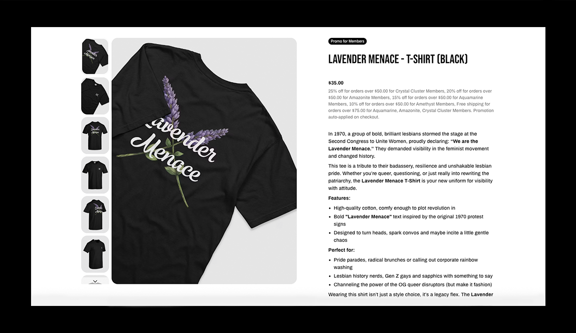 Their custom clothing features bold designs, such as the “Lavender Menace Tee" and "The Lesbian Tarot Card" Tee, along with hats, mugs, stickers, hoodies, and cozy blankets.