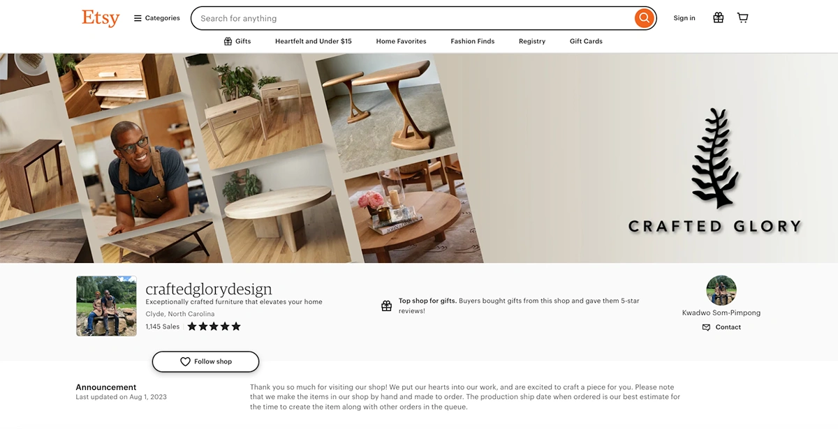Through their Etsy shop, they offer beautifully crafted wooden furniture like tables, chairs, bookshelves, and cutting boards, combining their passion for design with the flexibility of running a small business together.